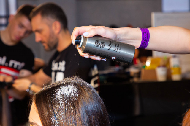 Create a radial parting from top of head to the top of the ears and apply label.m Fashion Edition Wax Spray and split into two sections.