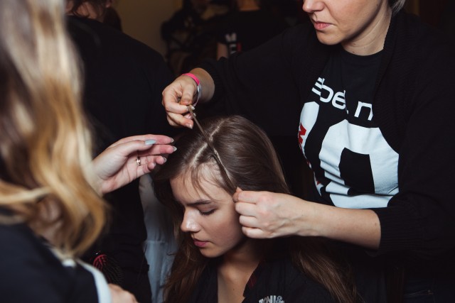 Leave baby hairs around hairline loose and free. Finish ends with invisible elastic and use light spray of label.m Hairspray to complete.