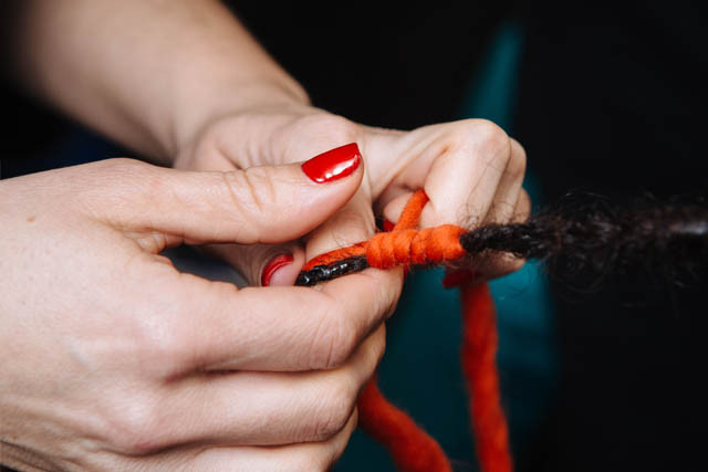 Taking the three back braids, interlace them together with Orange wool yarn all the way through to the ends. Finish with a light spritz of Hairspray.