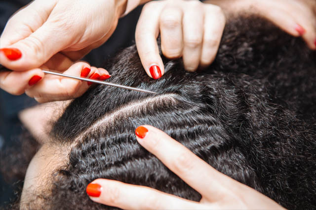 Work in a little label.m Soft Wax and then create scalp braids throughout the length of the hair.