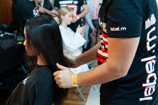 Spray a small amount of label.m Weightless Hairspray on the surface of the hair and gently comb through