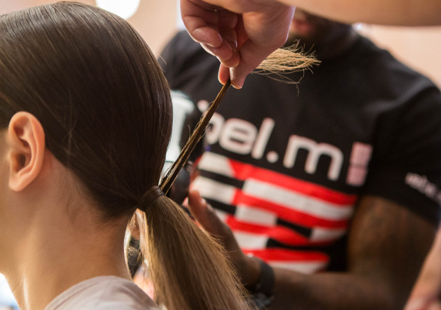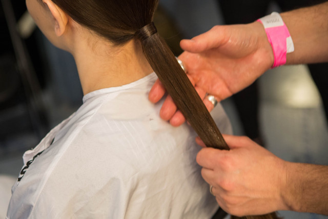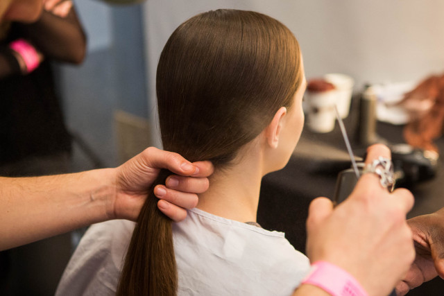 Gather hair into a low ponytail at the nape of the neck using label.m Hairpsray to smooth down and secure with elastic