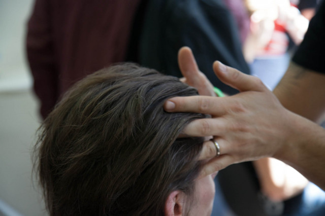Apply label.men Thickening Tonic and using your fingers, brush through away from the face