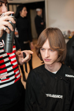 Following on from Daniel’s vision, Daniele and team created a style that harkened back to the 70s where hair wasn’t too polished or stylised. Using the model’s natural hair texture, the team created an easy, soft feathered look.