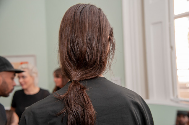 Use elastic to tie hair in a low and loose ponytail, allowing the hair to fall around the hairline