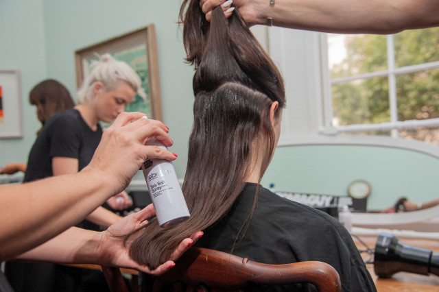 Section the hair horizontally and prep each layer with label.m Sea Salt Spray