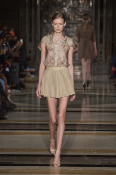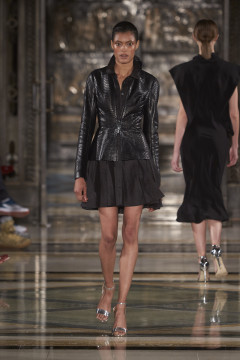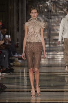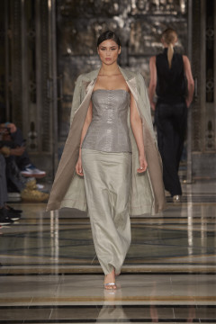 Continuing her signature use of bias cut layering of organic fluid fabrics juxtaposed with chic, clean fitted leather shapes and biker jackets. Masculine meets feminine this season with super fine tailored wool suiting worn with soft silk blouses
