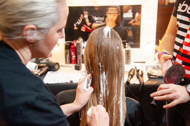 Use label.m Hairspray and take wider sections for the creation of deep waves. Taking a small tong on each section – wrap the hair tightly around the barrel for up to eight – 10 seconds. Release – then hold in place with section clips.