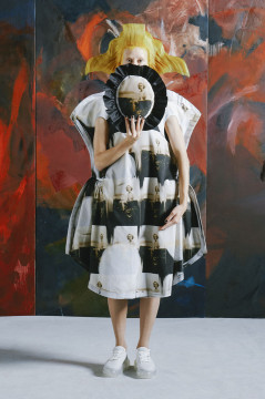 “The Girl Who Collected Memories” is a story of an imaginary character Rei. Amidst a Global Pandemic, as many of us, Rei feels insecure and out of control, like a leaf taken by the wild stream. To confront this feeling, she collects family photos of the people she never met and wears them as her clothes. Bringing her the feeling of belonging to the extended Global Family, these photos become her “armour”, protecting and empowering her. IA LONDON’S SS 2021 emerges from the context of a Global Pandemic. Proposing her point of view, designer Ira Iceberg symbolically uses light backgrounds, to oppose the darks, and silver-coated textiles as a base for the photographic prints, to emphasise their symbolic “armour” meaning. Iceberg also continues exploring the relationship between the body, form and image.