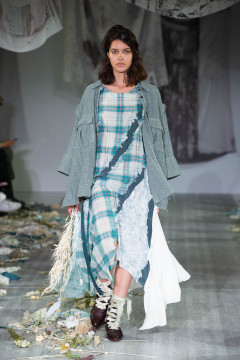 Now in its third season, Wen Pan fuses the spirit of oriental recluses with romantic grunge aesthetics. By using raw fluidity and layers of textures, Wen Pan evokes characters in a balance of subtlety and freedom for SS20 the brand explores the beauty of brokenness, traces of human presence. Chinese ancient recluses and the 1990 grunge. This is seen through contrasting floral prints and textures, mixing fragile linen layers and sheer silk fabrics with rough cotton drapery and asymmetric cutting.