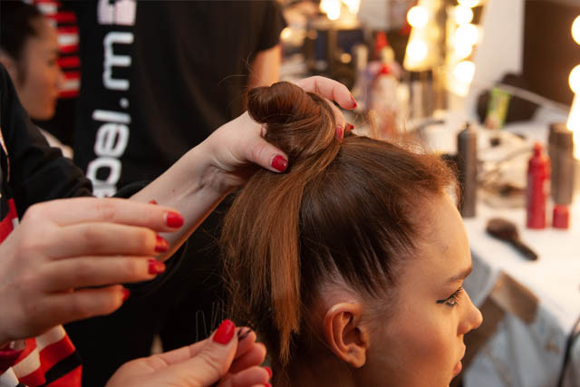 Join us backstage and front-row at London Fashion Week for Paul Costelloe AW19, where Head of Team Indira Schauwecker creates utilitarian twisted buns.