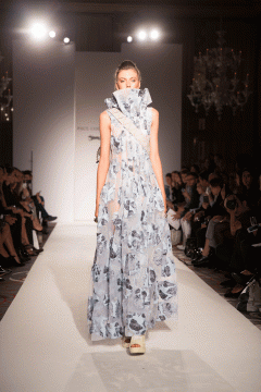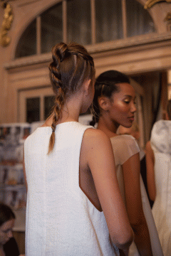 Bold and monochromatic colours with sharp silhouettes came together to create a warrior inspired collection. Collaborating high and securely fastened ponytails, and on-trend intricate braiding, the catwalk saw the fusion of the two looks to amplify the fierce collection.
