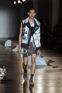 Community and belonging are at the core of the new collection by Per Gotesson, as they are of his work and life. Denim is Per’s signature material, cut into a trench with unassuming shape at the shoulders and voluminous elegance in the body. There’s also a strict-line double-breasted long denim coat that lined with fleece, and a short black jackete with rough-cut seems at the sleeve head. Workwear is used to subvert masculinity, seen through blood-red crushed velvet aprons and a long t-shirt dress that’s ruched at the chest bone.