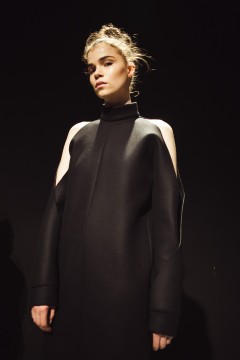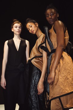 Hold ponytail high above head and twist so that it folds back on itself. Fold into a twisted donut and secure around the elastic with label.m Grips. Allow a few hairs to come free.