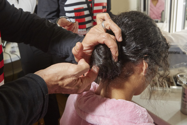 Depending on texture, prep hair with either label.m Resurrection Dust (very fine), label.m Hairspray (medium texture) or label.m Texturing Volume Spray (very thick)