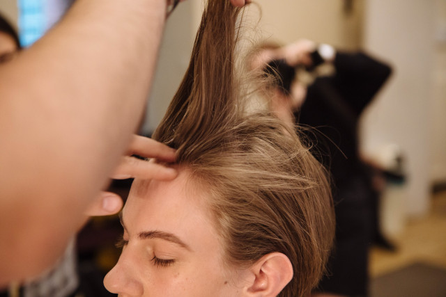 Mist hair with label.m Sea Salt Spray to add a gritty texture, then once you’re happy with the shape, set with label.m Hairspray to hold in place