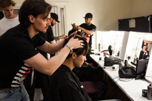 As this show involved many designers from Jermyn Street, working with each model’s natural texture was key. If hair was straight products such as label.men Deconstructor to separate and exaggerate was used, if hair was curly it was more about softening it up with label.m Leave-In Conditioner and then adding a matt effect with label.m Matt Paste
