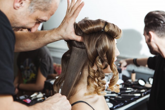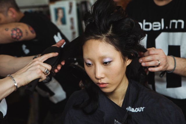 Split the back section into layers. Use label.m hairspray and pull fingers downwards through the hair to lock style in place.