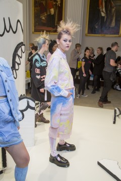 comic book mixed with military influences. Pastels mixed with bright hand painted fabrics.