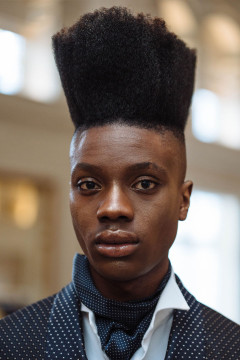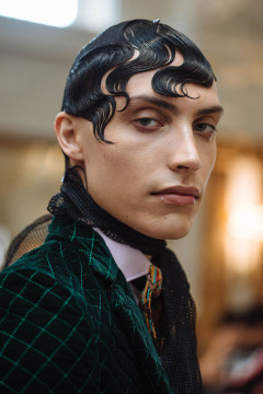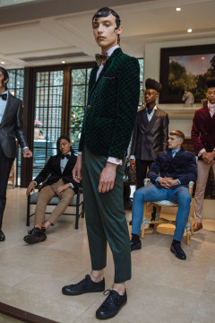 Inspiration is drawn from the emergence of a more daring break for menswear in the 1950’s. As the collection notes the departure from the classic black tuxedo to a more sculpted silhouette, similarly the hair takes on the concept of strong pompadour shapes to capture the essence of the ‘golden era’.