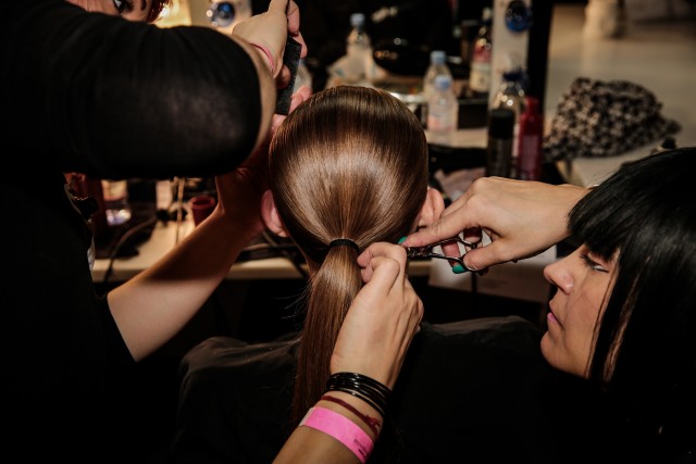 Spray the top of the head with a little label.m label.m Hairspray and comb hair flat into a sleek ponytail, using the palm of the hand and a pintail comb to flatten and smooth the hair. Secure with elastic.