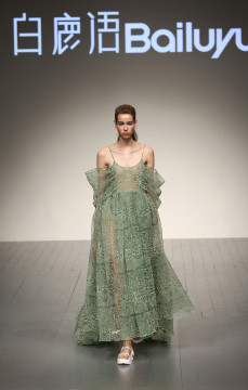 Inspired by the deer, considered to be a lucky and beautiful animal in Chinese culture. It appears in subtle prints across tops, as appliques and on an incredible flocked pale sage organza gown.