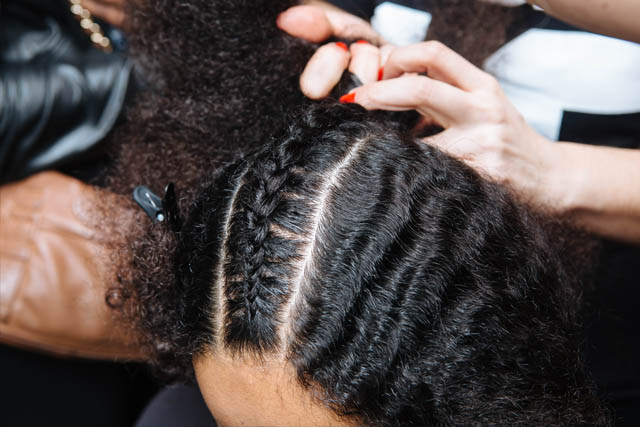 Work in a little label.m Soft Wax and then create scalp braids throughout the length of the hair.