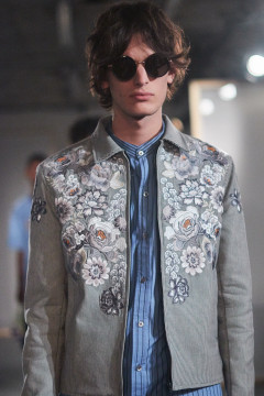The hair reflects the collection motif using the late 60s and 70s as inspiration. A lot of movement, easy and not too neat, think a young Mick Jagger.