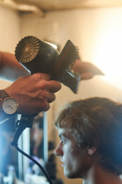 Create some movement by wrap drying hair from side to side using the label.m Cushion Brush and Tourmaline Dryer