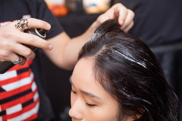 Section-by-section, spraying from the back towards the front, apply label.m Texturising Volume Spray and working close to the top area, take a session brush and start to gently back-comb.