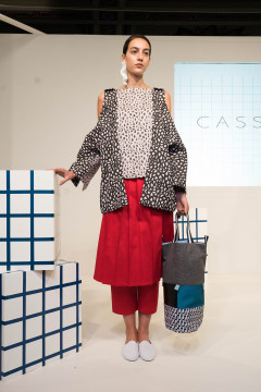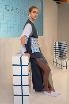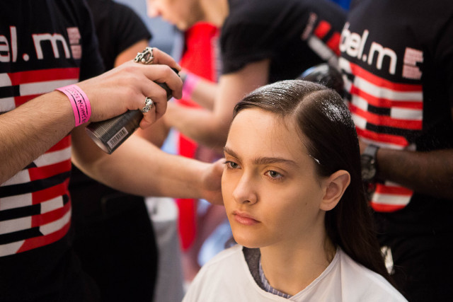 Gather hair into a low ponytail at the nape of the neck using label.m Hairpsray to smooth down and secure with elastic