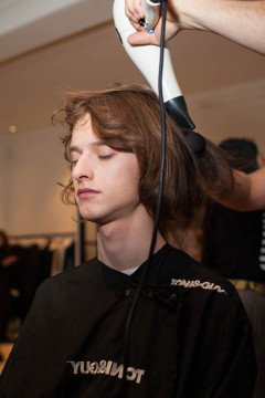 Following on from Daniel’s vision, Daniele and team created a style that harkened back to the 70s where hair wasn’t too polished or stylised. Using the model’s natural hair texture, the team created an easy, soft feathered look.