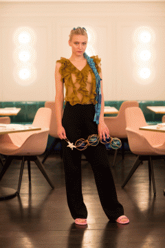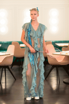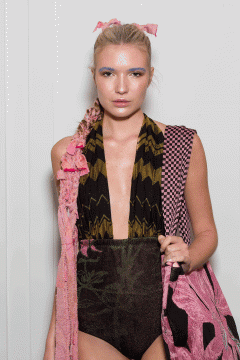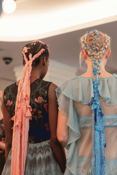 Inspired by Nereids, beautiful young girls of the sea in Greek Mythology, Ekaterina Kukhareva has created a mysterious and unique presentation for her SS17 collection. The ready-to-wear pieces all feature intricate designs and patterns in a striking turquoise, baby pink and coral palette. To add a modern edge, the hair has been braided into three-strand braids with woollen fabric entwined into it, to create the illusion of coloured dreadlocks.