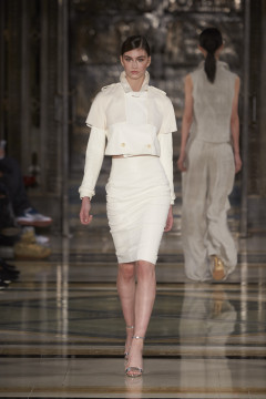 Continuing her signature use of bias cut layering of organic fluid fabrics juxtaposed with chic, clean fitted leather shapes and biker jackets. Masculine meets feminine this season with super fine tailored wool suiting worn with soft silk blouses