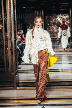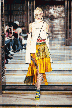 The hair complimented the designer’s inspiration by providing an urban edge to the final look. Irregular braiding was created, which was embellished with accessories to add a feminine touch