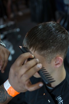 Comb the hair forward using the label.m De-Tangling Comb: Anti Static and label.m Hold & Gloss Spray to finish.