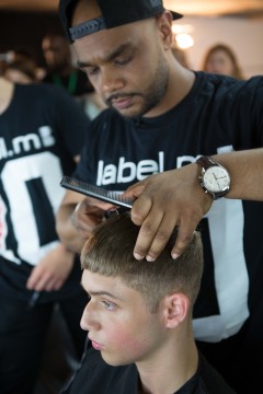 Using label.m Sculpting Pomade, rub the product in your hands and apply liberally.