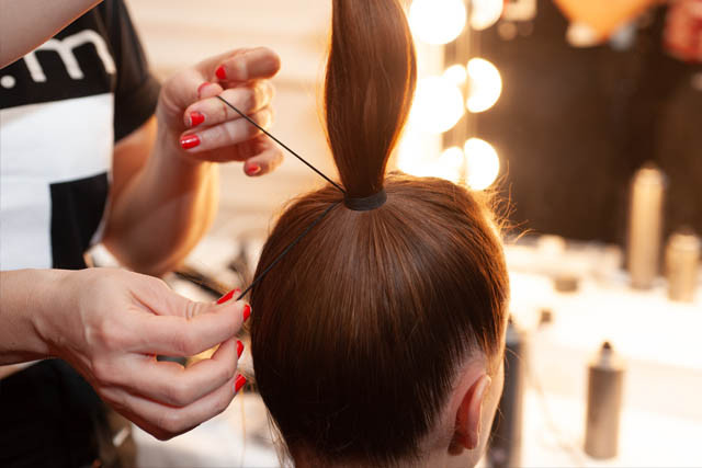 Combing the hair up to the top of the head brushing through to smooth ponytail. Apply hairspray for grip and using a fine comb to create shape but not to make perfect giving a really effortess look.