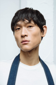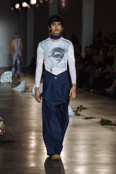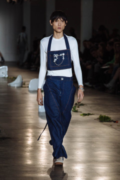 Community and belonging are at the core of the new collection by Per Gotesson, as they are of his work and life. Denim is Per’s signature material, cut into a trench with unassuming shape at the shoulders and voluminous elegance in the body. There’s also a strict-line double-breasted long denim coat that lined with fleece, and a short black jackete with rough-cut seems at the sleeve head. Workwear is used to subvert masculinity, seen through blood-red crushed velvet aprons and a long t-shirt dress that’s ruched at the chest bone.