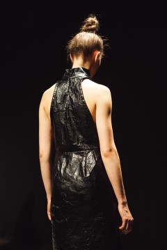 Hold ponytail high above head and twist so that it folds back on itself. Fold into a twisted donut and secure around the elastic with label.m Grips. Allow a few hairs to come free.