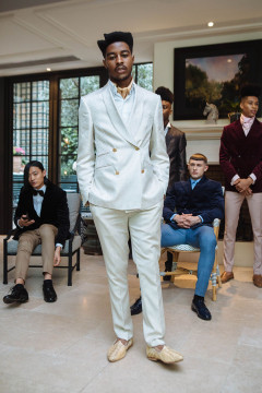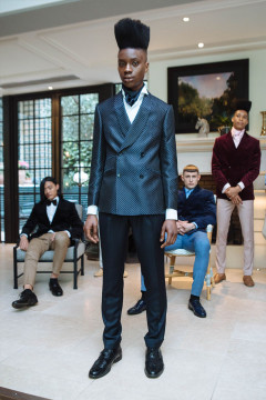 Inspiration is drawn from the emergence of a more daring break for menswear in the 1950’s. As the collection notes the departure from the classic black tuxedo to a more sculpted silhouette, similarly the hair takes on the concept of strong pompadour shapes to capture the essence of the ‘golden era’.