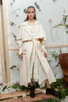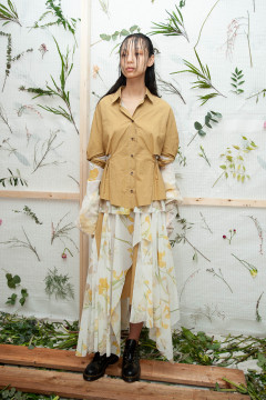 Wen Pan AW20 brings an image of quietness in chaos and celebrates the romance found in traces of human activities. What we found most beautiful in a crowded flower market was the road when the market finished. When stalls and people left, there were always flowers, petals, cut stems smashed on the road, into the water, which formed a raw romance in a random way. Smashed flowers are shown as the designer’s own prints on sheer cotton, contrasting with textured and coated cotton, which refers to wet rough roads